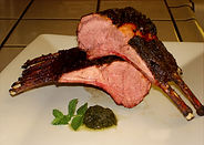 Mint Rubbed Lamb: A rack of lamb massaged with a mint, sugar, and a spices mixture then slow roasted. Served with a fresh mint pesto (a refreshing alternative to the traditional jar of mint jelly).